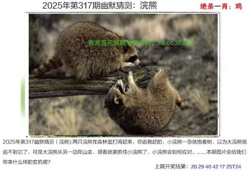 317期图片猜测(浣熊)【开:發00】 两只浣熊在森林里打闹起来,你追我赶的,小浣熊一急就抱着树,以为大浣熊就追不到它了,可是大浣熊从另一边爬山去,眼看就要抓住小浣熊了,小浣熊会如何应对。......本期图片会给我们带来什么样的玄机呢? 解:浣熊解野兽肖鼠虎兔龙蛇猴幽默猜测推荐六肖:猴蛇龙鼠兔虎本期猜测看好十码:10.34.01.49.02.38.06.18.15.28点击注册30.cc娱乐城3090.com大额无忧 |